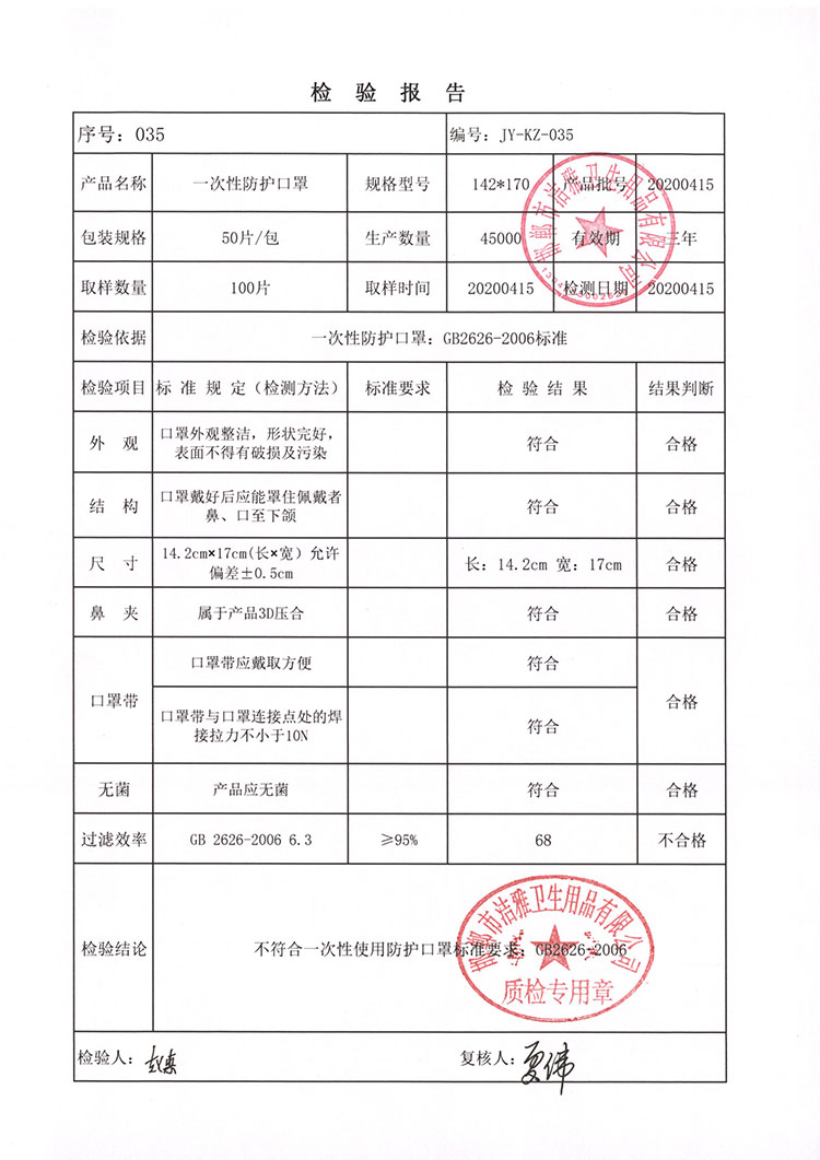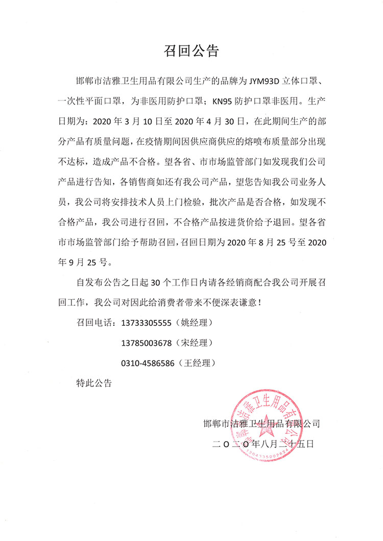 邯鄲市潔雅衛(wèi)生用品有限公司生產(chǎn)的品牌為JYM93D立體口罩一次性平面口罩,為非醫(yī)用防護口罩;KN95 防護口罩非醫(yī)用。生產(chǎn)日期為:2020年3月10日至2020年4月30日,在此期間生產(chǎn)的部分產(chǎn)品有質(zhì)量問題,在疫情期間因供應(yīng)商供應(yīng)的熔噴布質(zhì)量部分出現(xiàn)不達標,造成產(chǎn)品不合格。望各省、市市場監(jiān)管部門如發(fā)現(xiàn)我們公司產(chǎn)品進行告知,各銷售商如還有我公司產(chǎn)品,望您告知我公司業(yè)務(wù)人員,我公司將安排技術(shù)人員上門檢驗,批次產(chǎn)品是否合格,如發(fā)現(xiàn)不合格產(chǎn)品,我公司進行召回,不合格產(chǎn)品按進貨價給予退回。望各省市市場監(jiān)管部門給予幫助召回召回日期為2020年8月25號至2020年9月25號